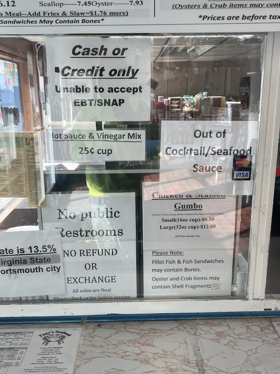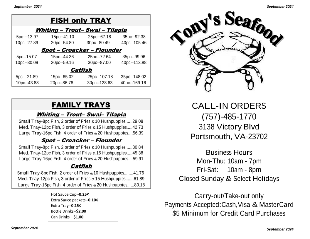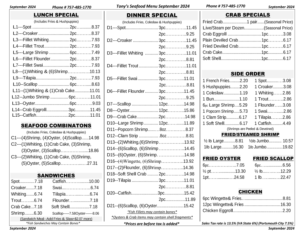 Tony Crab & Seafood Menu