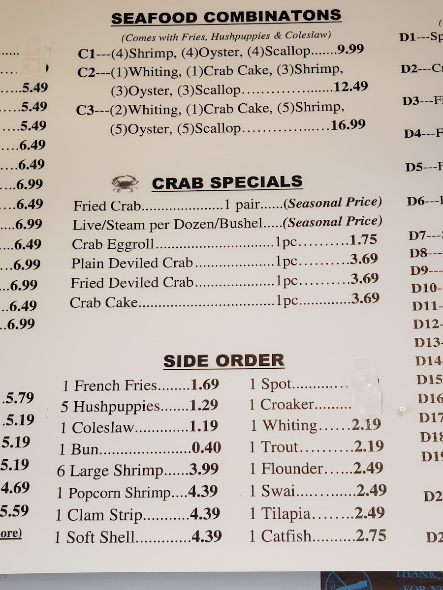 Whether you're stopping in for a quick takeout or sharing a family tray, the menu highlights include classic fried crabs, catfish dinners, crab cakes, chicken wings, and seafood platters. These options come ready with traditional sides like hush puppies, fries, and coleslaw, creating a well-rounded meal that feels both hearty and familiar.